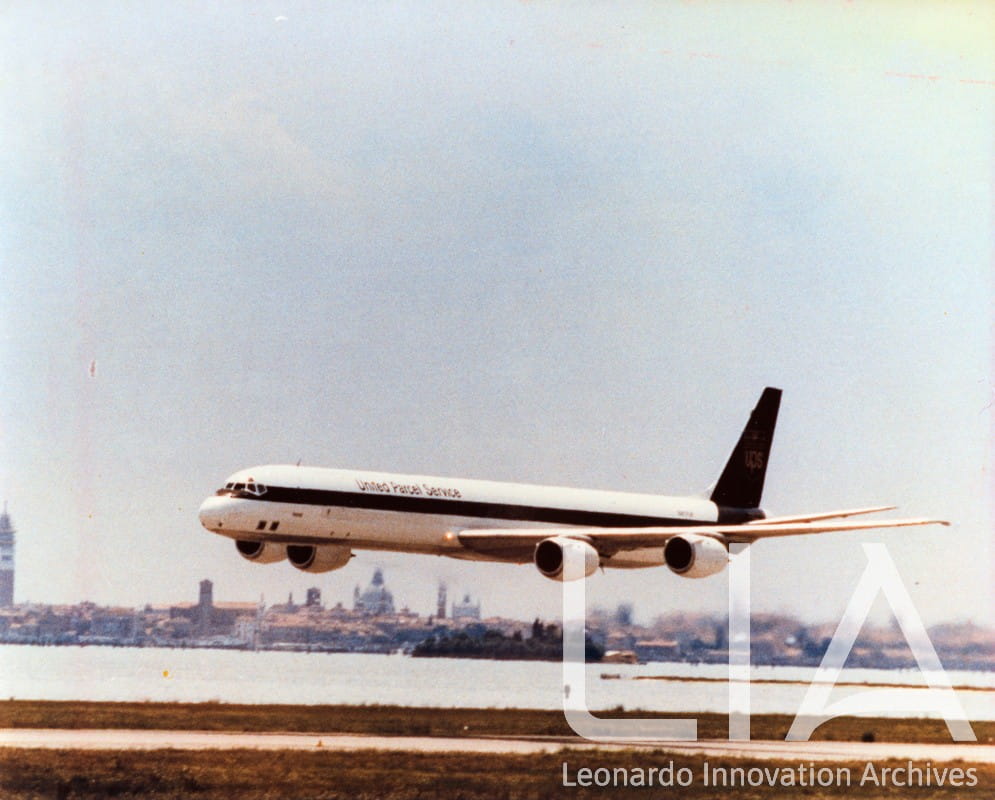 Parte di Douglas DC-8 livrea UPS - passaggio a bassa quota con i carrelli retratti