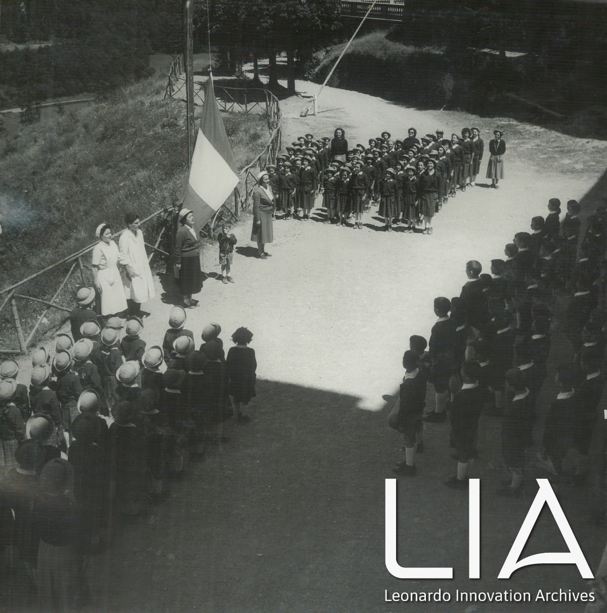 Cerimonia dell'alzabandiera sul piazzale della colonia